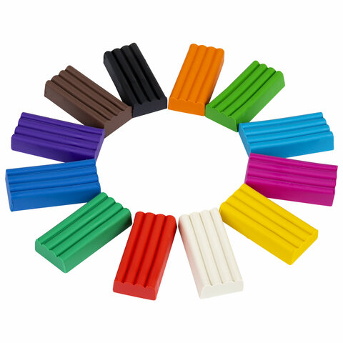 В составе набора 12 цветов: белый, черный, синий, красный, зеленый, желтый, оранжевый, светло-зеленый, коричневый, голубой, фиолетовый, лиловый. Масса набора - 180 г. Поставляется в комплекте со стеком, с помощью которого ребенок может разделять пластилин на части или наносить орнамент на свои поделки.
